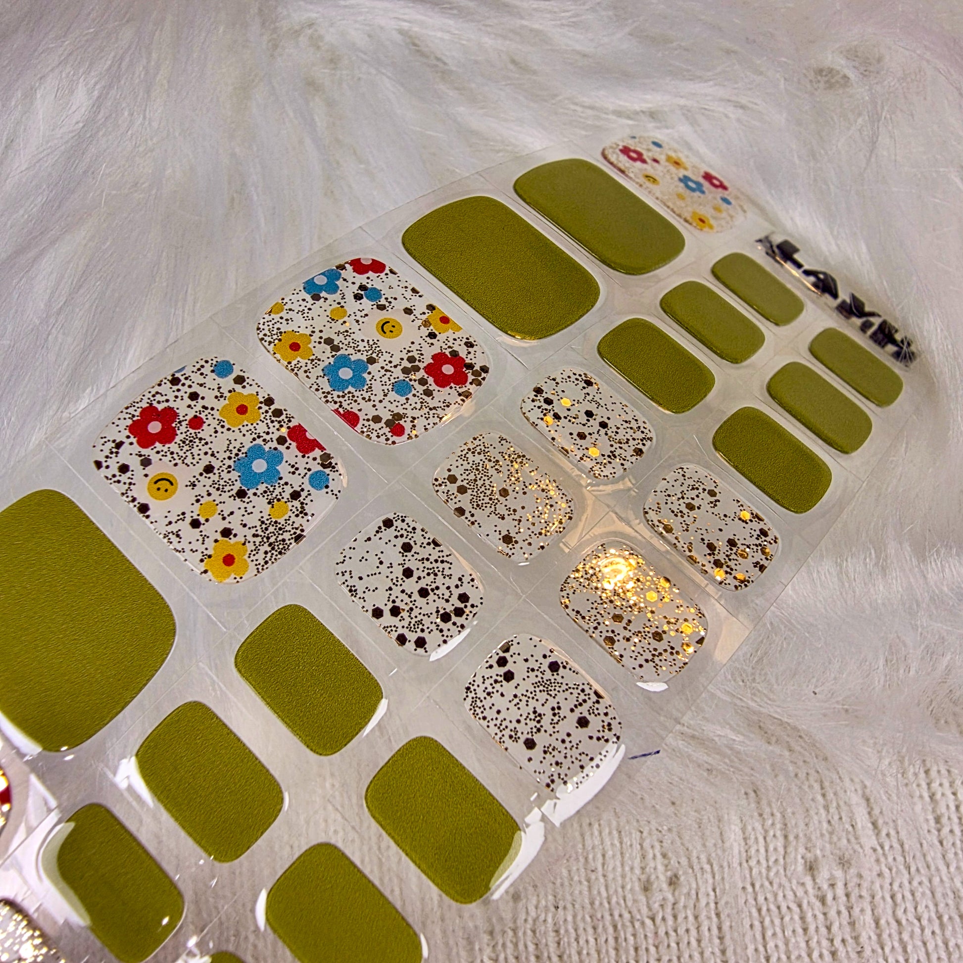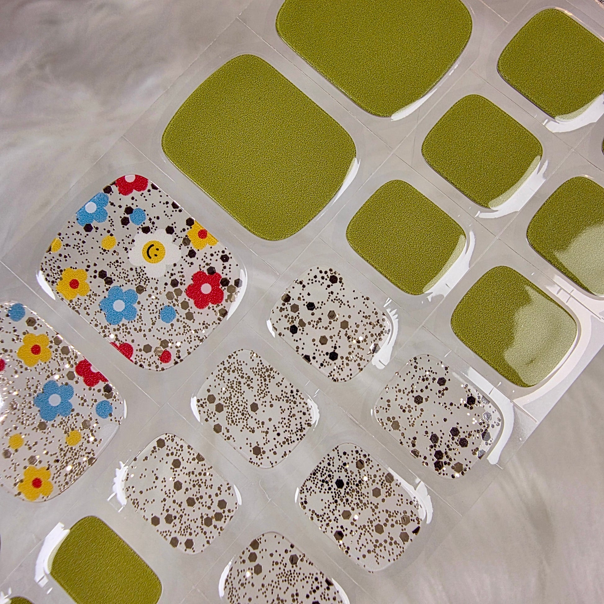 Bright olive greens paired with cheerful floral accents create a fun, lively pedicure that instantly lifts your mood. This set blends earthy tones with bursts of colour, making it perfect for sunny days, picnics, weekend outfits, and anyone who loves a cute but stylish toe look. The mix of solid shades and floral patterns gives your toes a refreshing, youthful finish.