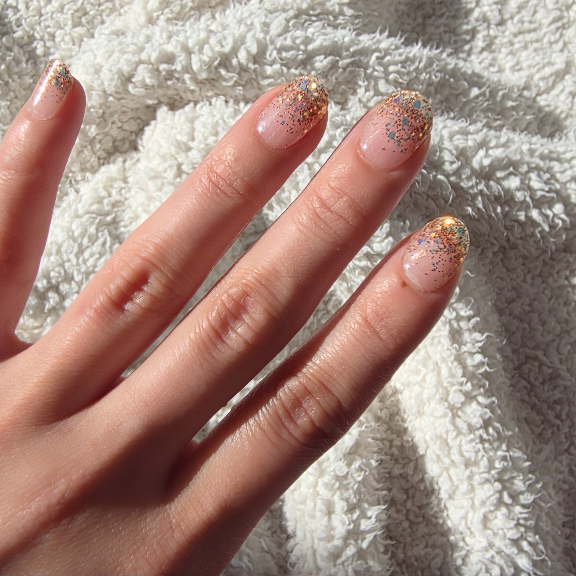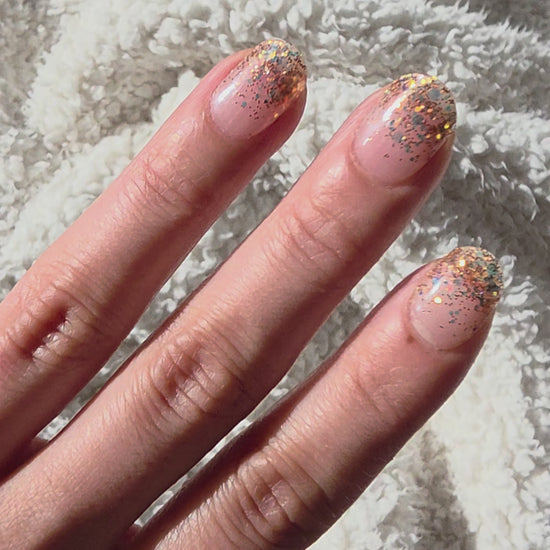 From certain angles, a gentle blue sheen appears and dances with the warm gold shimmer — creating a glow that feels dreamy, elegant, and never over the top.